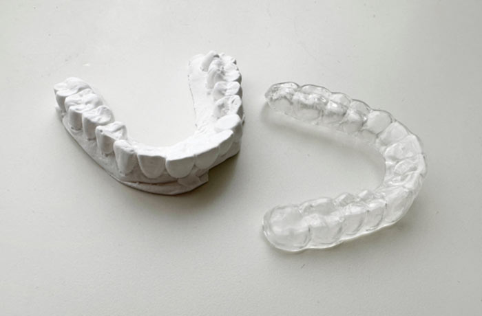 歯科では歯を守るためのマウスピース(ナイトガード)を作成することができます。マウスピースをつけると歯にかかる力が分散され、歯のすり減りなどを防ぐことができます。