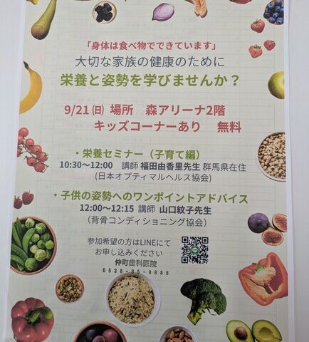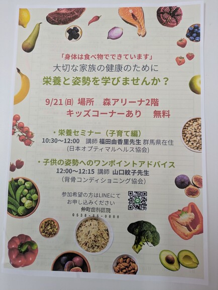 前回に引き続き同じ講師の方々をお招きし、子育て世代に向けた「栄養セミナー」と「お子様の姿勢ワンポイントアドバイス」の2本立てで、イベントを開催いたしました。