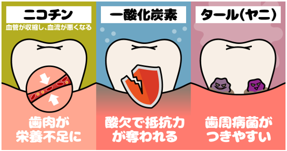 タバコが歯周病の進行を早める主な原因は、煙に含まれる3つの有害物質(ニコチン・一酸化炭素・タール)です。