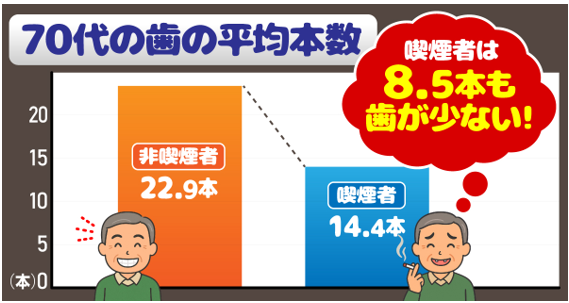 しかし、タバコの害で本当に怖いのは、歯の寿命そのものを縮めてしまうことです。ある調査では、70代の喫煙者は非喫煙者よりも平均で約8.5本も歯が少ないという結果が報告されています。
